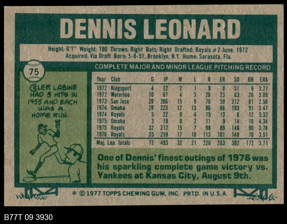 | 1977 Topps #75 Dennis Leonard | 4 - VG/EX | Front | Back |