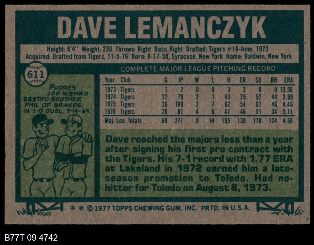 | 1977 Topps #611 Dave Lemanczyk | 4 - VG/EX | Front | Back |