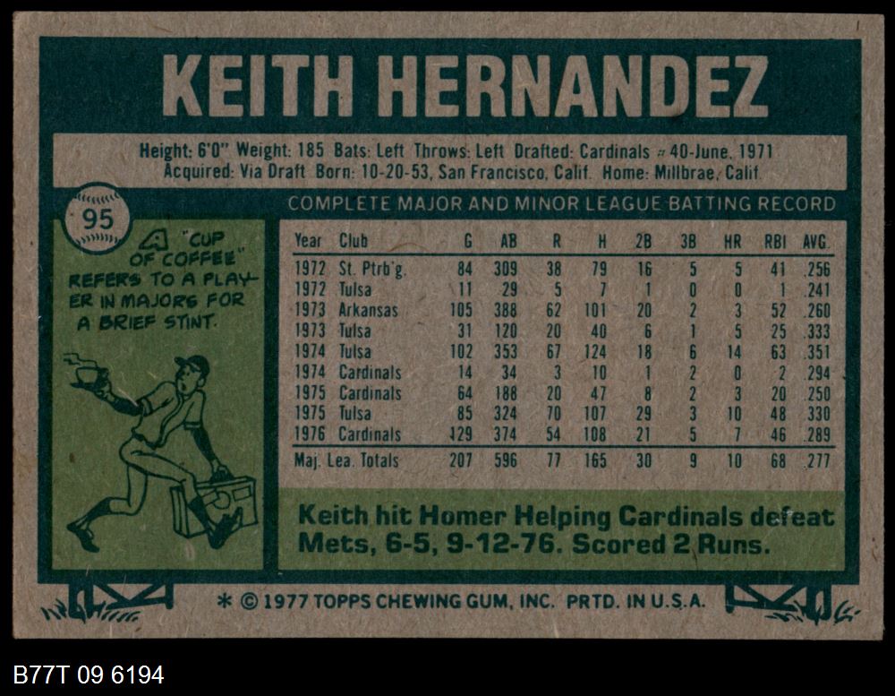 | 1977 Topps #95 Keith Hernandez | 4 - VG/EX | Front | Back |