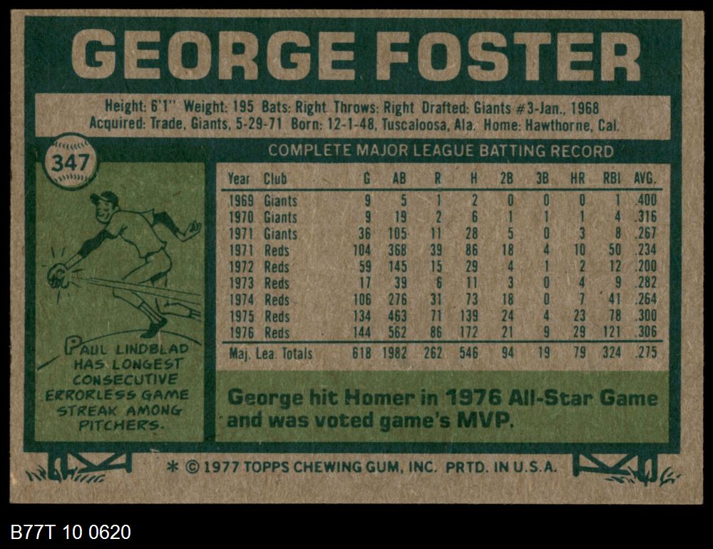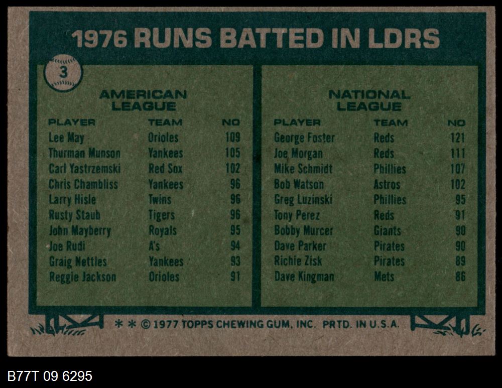 | 1977 Topps #3 - Lee May / George Foster RBI Leaders | 4 - VG/EX | Front | Back |