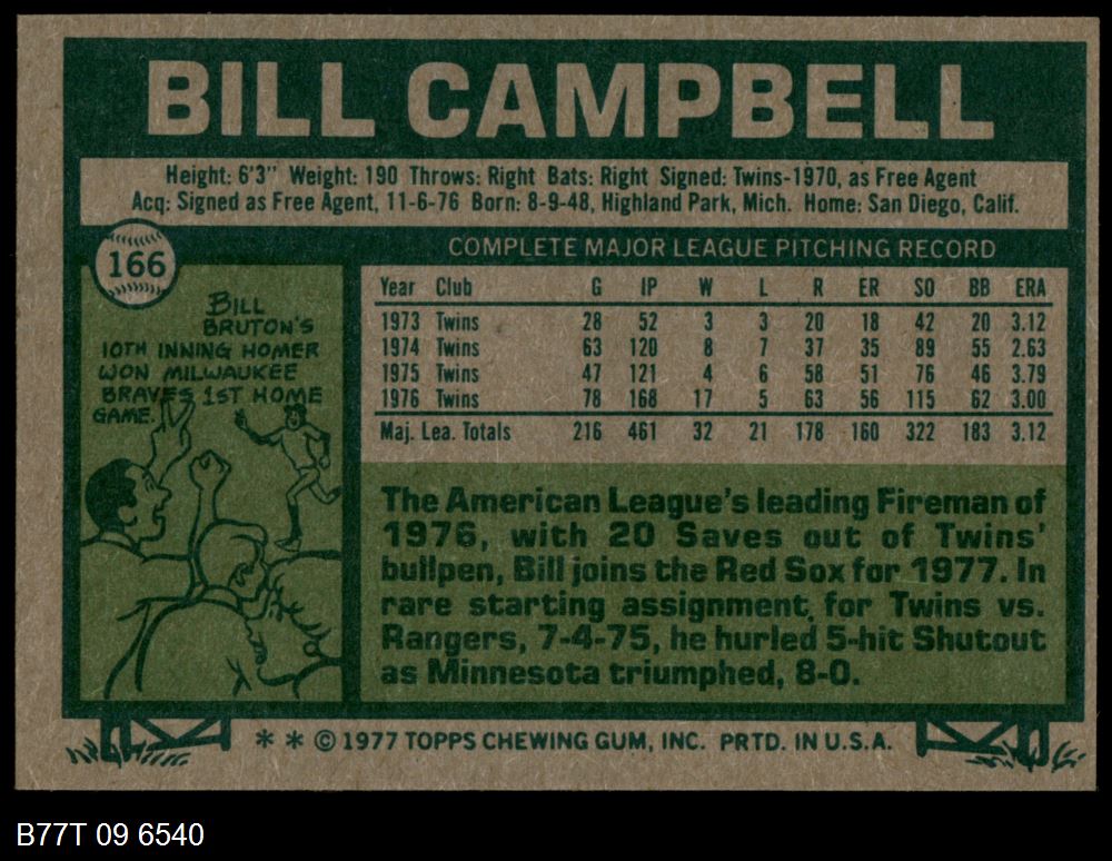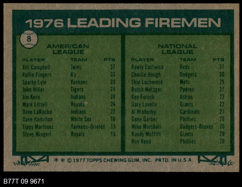 | 1977 Topps #8 - Bill Campbell / Rawly Eastwick Leading Firemen | 5 - EX | Front | Back |