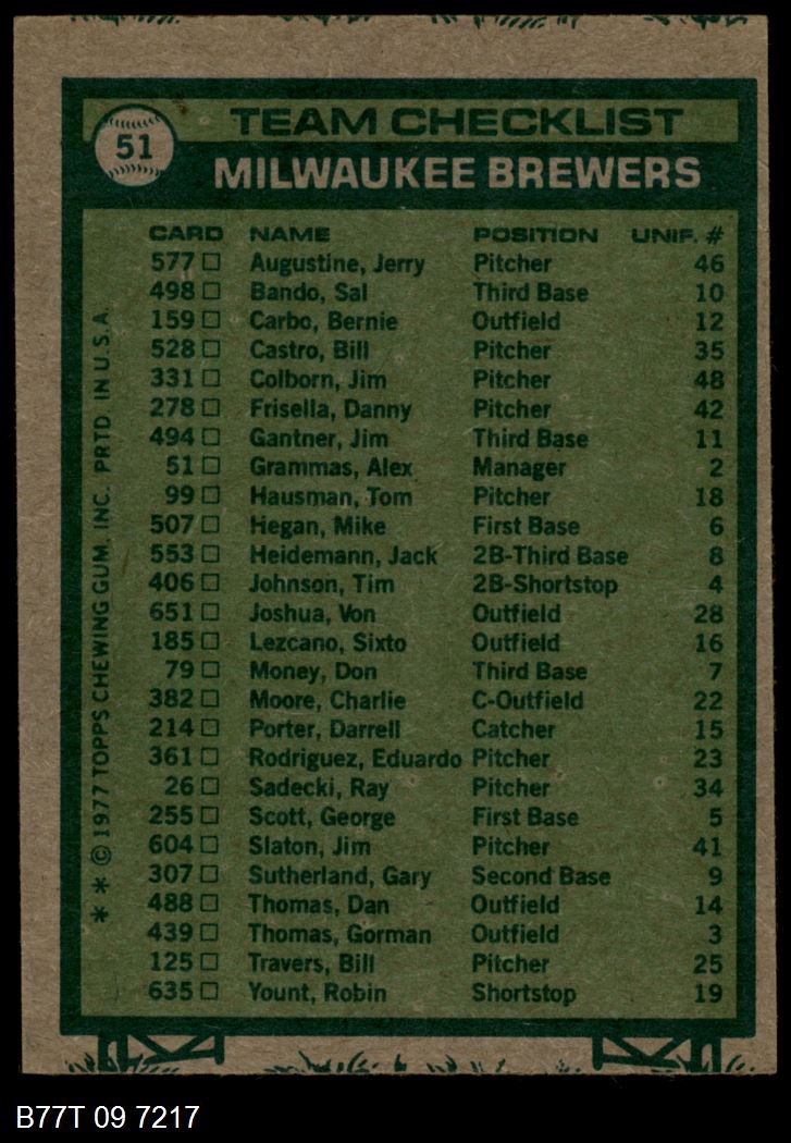 | 1977 Topps #51 - Alex Grammas Brewers Team Checklist | 4 - VG/EX | Front | Back |