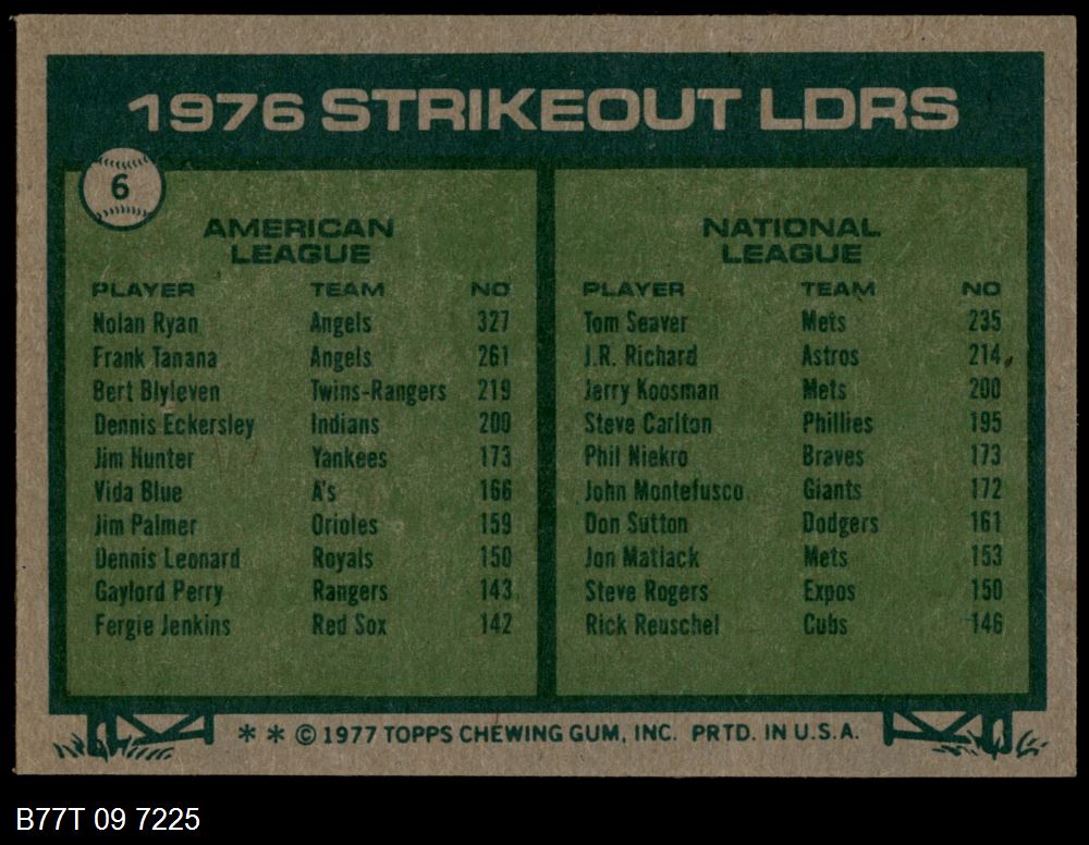 | 1977 Topps #6 - Nolan Ryan / Tom Seaver Strikeout Leaders | 5 - EX | Front | Back |