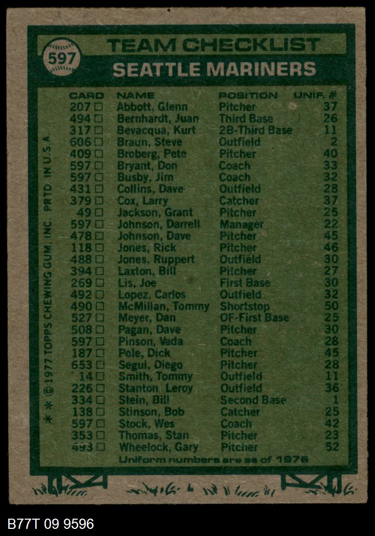 | 1977 Topps #597 - Darrell Johnson / Don Bryant / Vada Pinson / Jim Busby / Wes Stock Mariners Leaders | 3.5 - VG+ | Front | Back |