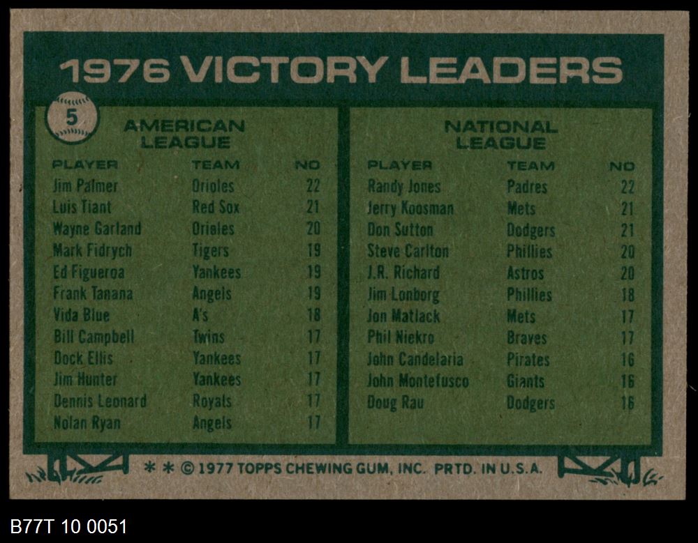 | 1977 Topps #5 - Jim Palmer / Randy Jones Pitching Leaders | 5.5 - EX+ | Front | Back |