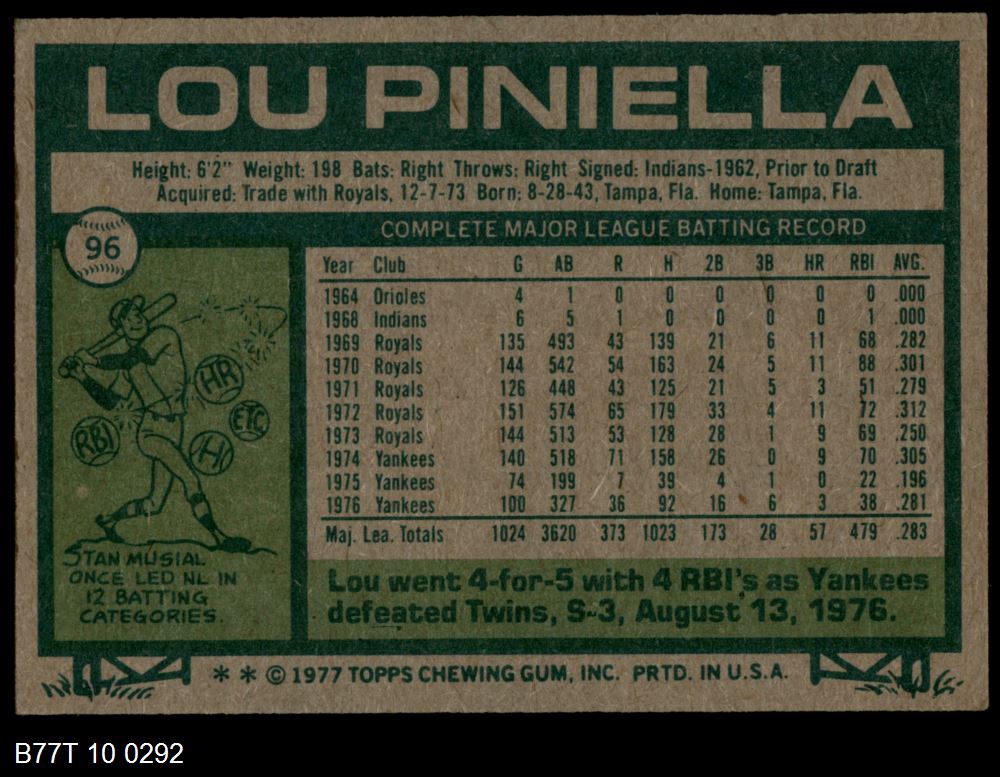 | 1977 Topps #96 Lou Piniella | 4.5 - VG/EX+ | Front | Back |