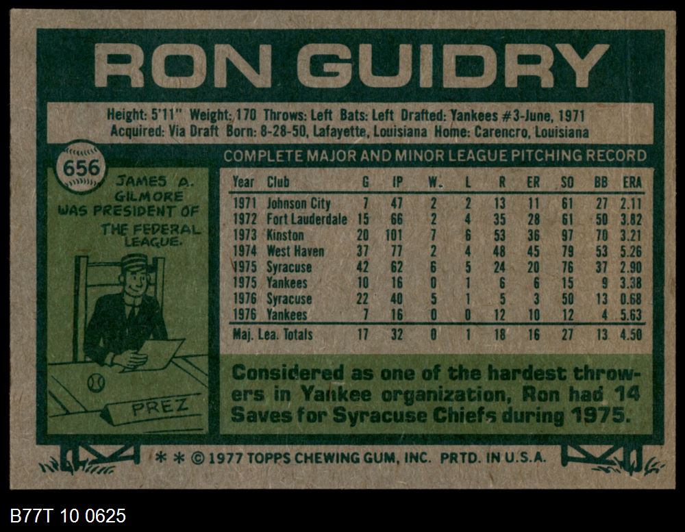 | 1977 Topps #656 Ron Guidry | 4 - VG/EX | Front | Back |