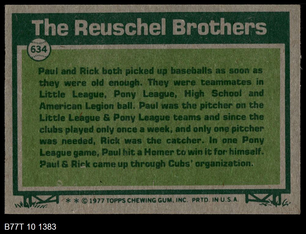 | 1977 Topps #634 Photos of Brothers Switched - Paul Reuschel / Rick Reuschel Big League Brothers | 4 - VG/EX | Front | Back |