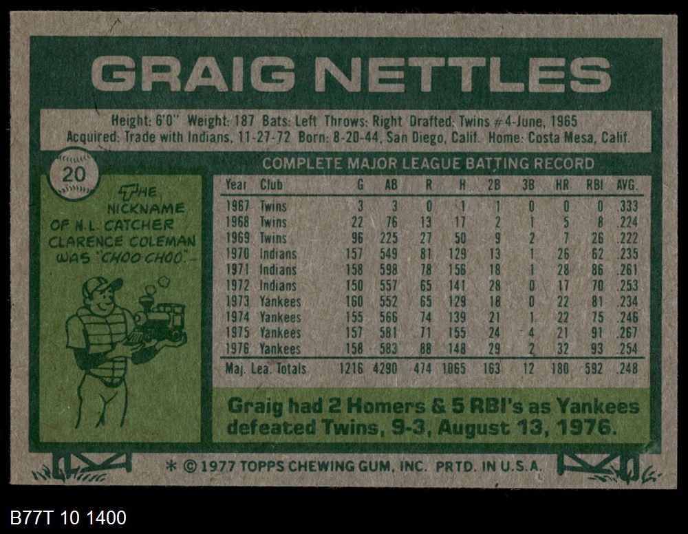 | 1977 Topps #20 Graig Nettles | 4 - VG/EX | Front | Back |