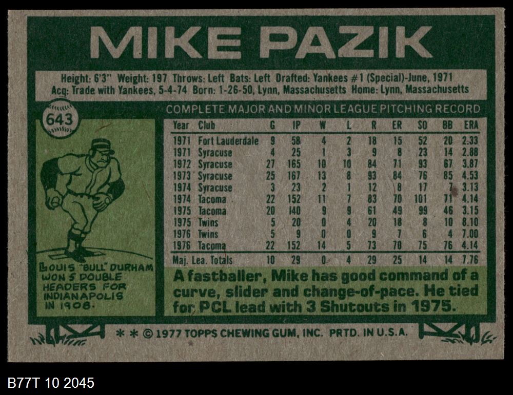 | 1977 Topps #643 Mike Pazik | 4 - VG/EX | Front | Back |