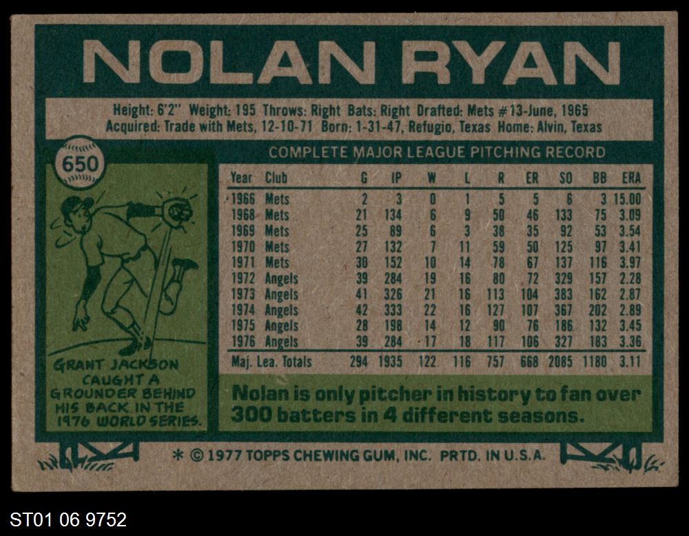 | 1977 Topps #650 Nolan Ryan | 4 - VG/EX | Front | Back |