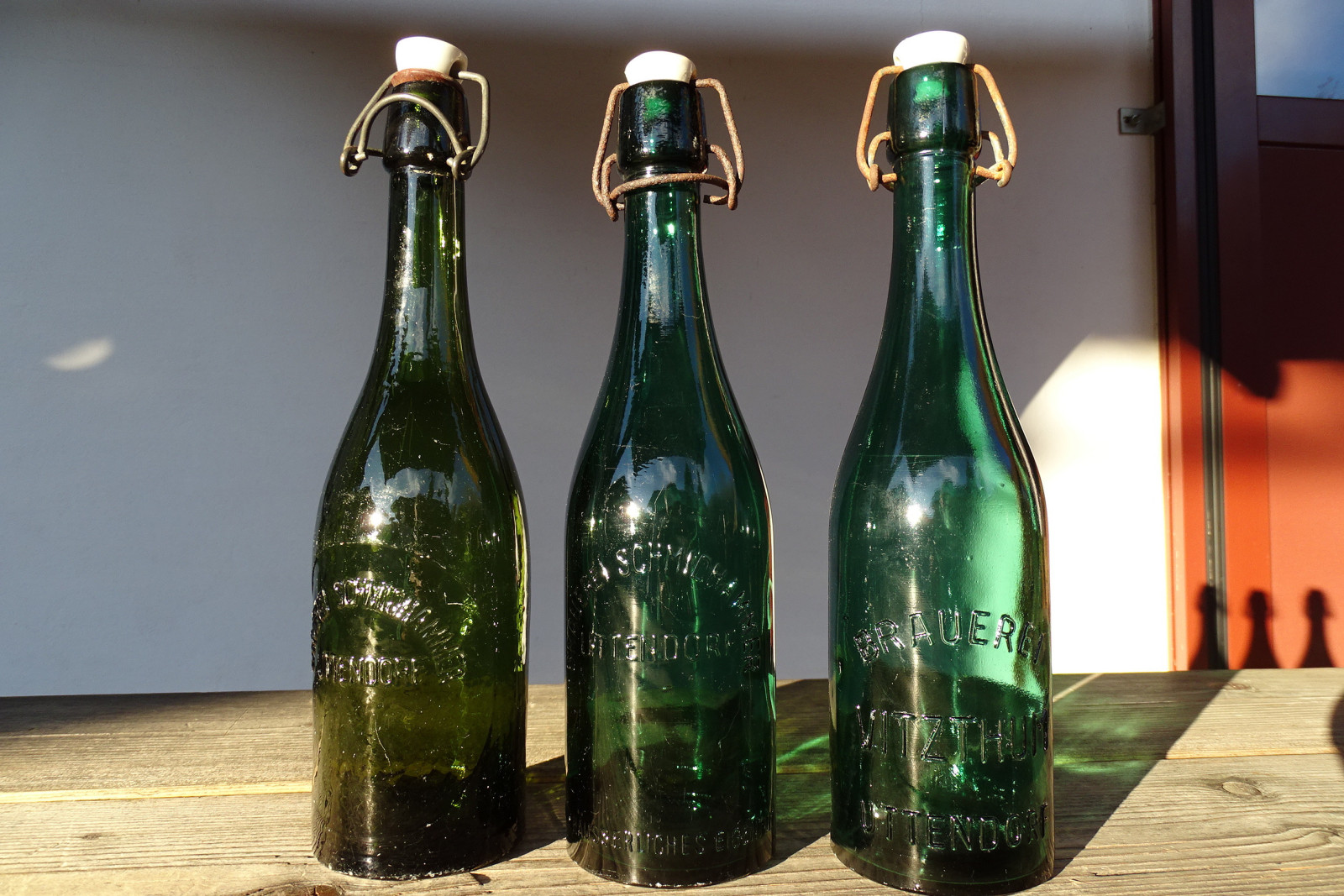 Normale Gebrauchspuren, einmal noch mit Etikette und einmal mit original Porzellanverschluss.