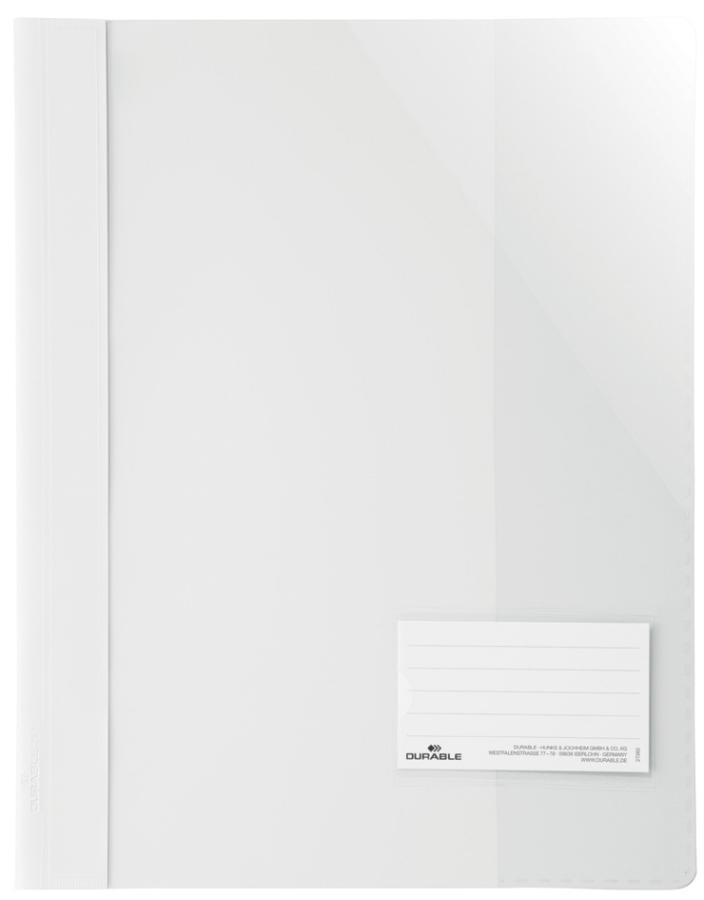 DURABLE Schnellhefter Überbreit, A4+, PVC, weiß mit Beschriftungsfenster 90 x 57 mm, transparenter Vorderdeckel, Rücken farbig, ummantelte Heftmechanik Innentasche auf der Rückseite für ungelochte Unterlagen