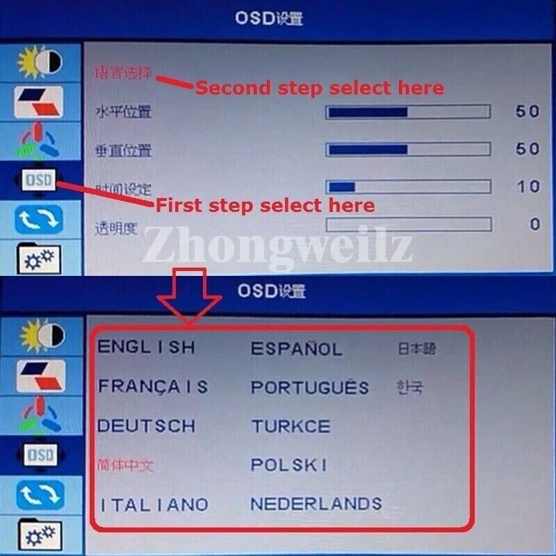 OSD: Brightness Contrast VOL+ VOL- Language And So On