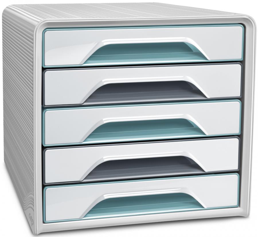 CEP Schubladenbox Smoove Riviera, 5 Schübe, weiß / blau mit strukturierter Oberfläche, mit Griffloch, Dekorrahmen, Beschriftungsbereich, mit ergonomischen Griffe, rutschfeste Gummifüßchen (im Lieferumfang), für Format DIN A4, (7-111 Ri / 1071110571)Maße: (B)288 x (T)360 x (H)270 mm