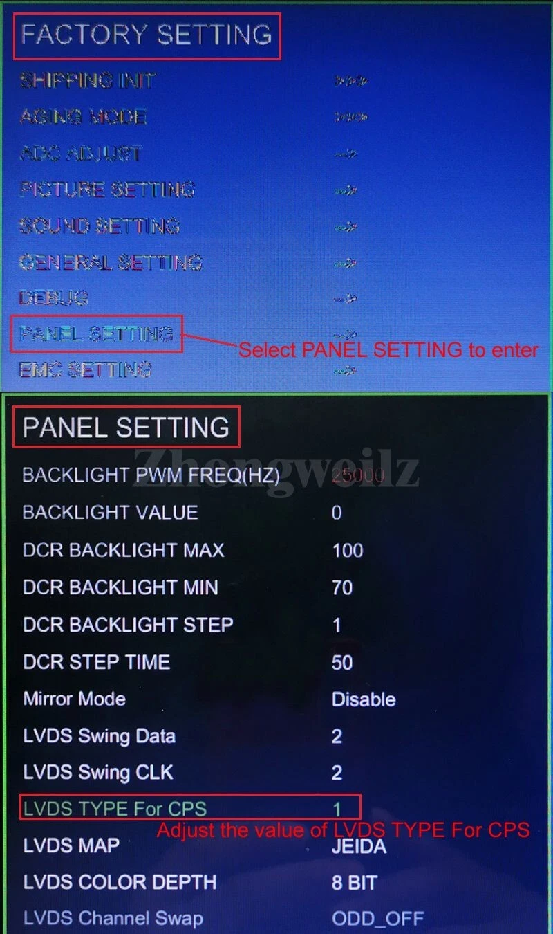 3. Adjust the value in the "LVDS TYPE FOR CPS" option until the color returns to normal.