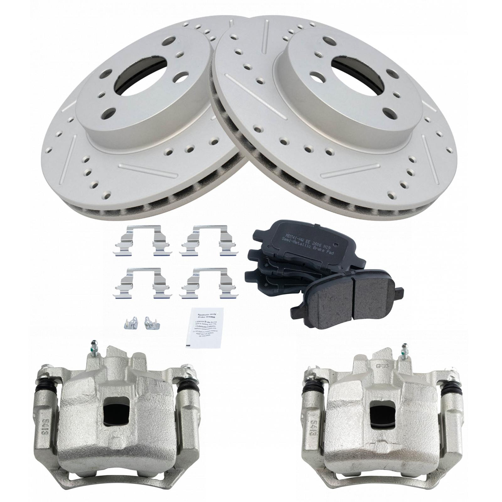 Kit Includes:(2) Front Performance Brake Rotors, Kit Includes:(1) Front Semi-Metallic Brake Pad Set with Contact Point Grease & Hardware, Kit Includes:(2) Front Brake Calipers with Hardware & Mounting Brackets
