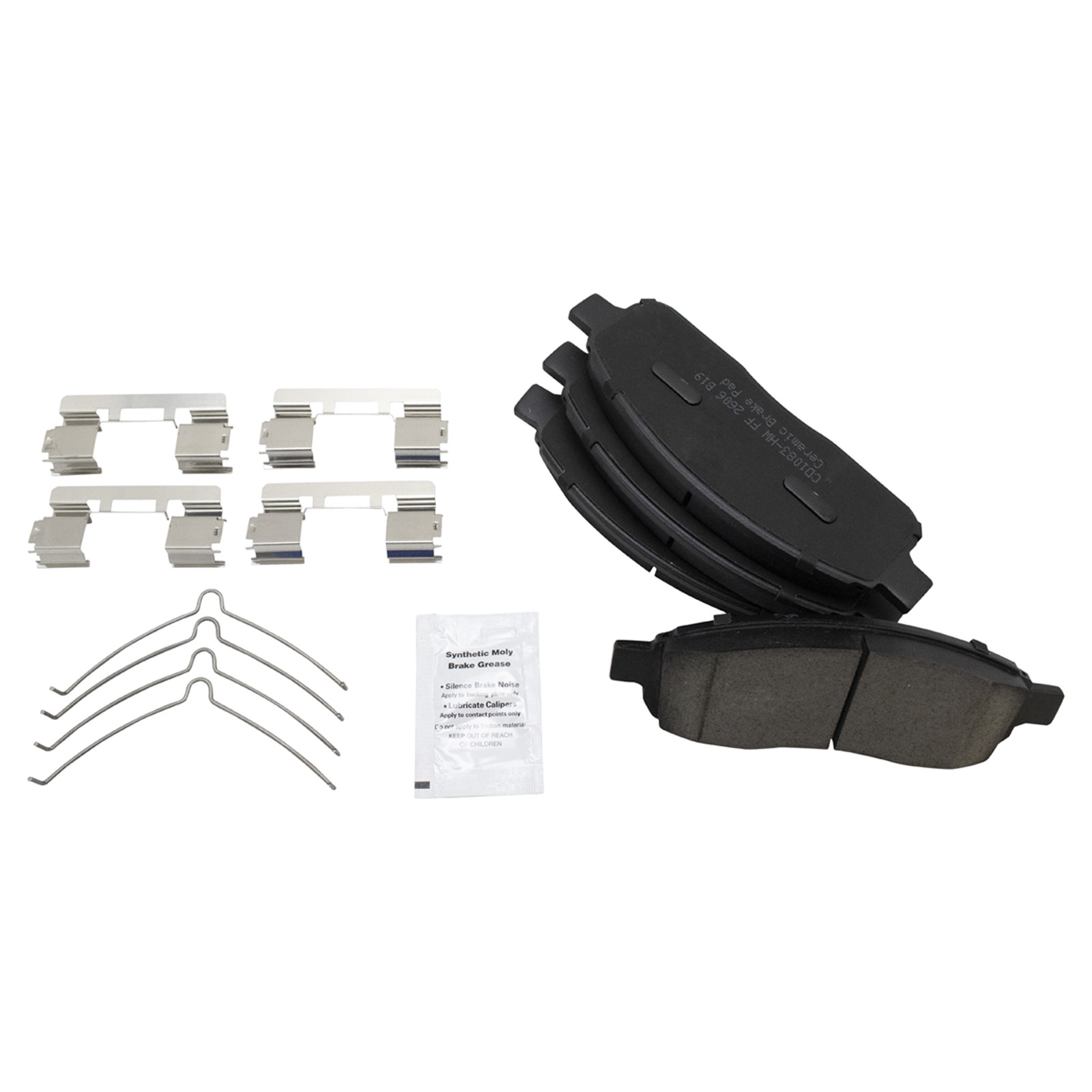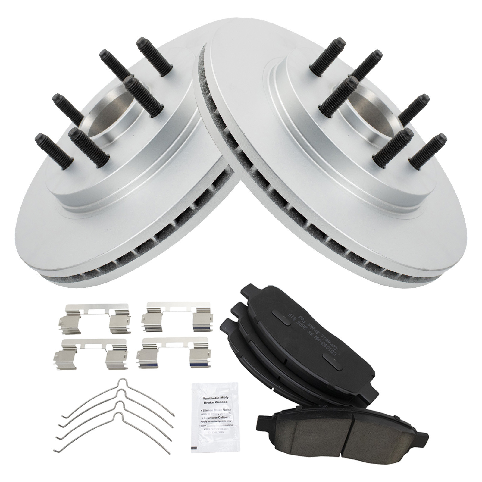 Kit Includes:(1) Front Ceramic Brake Pad Set with Contact Point Grease & Hardware, Kit Includes:(2) Front G-Coated Brake Rotors