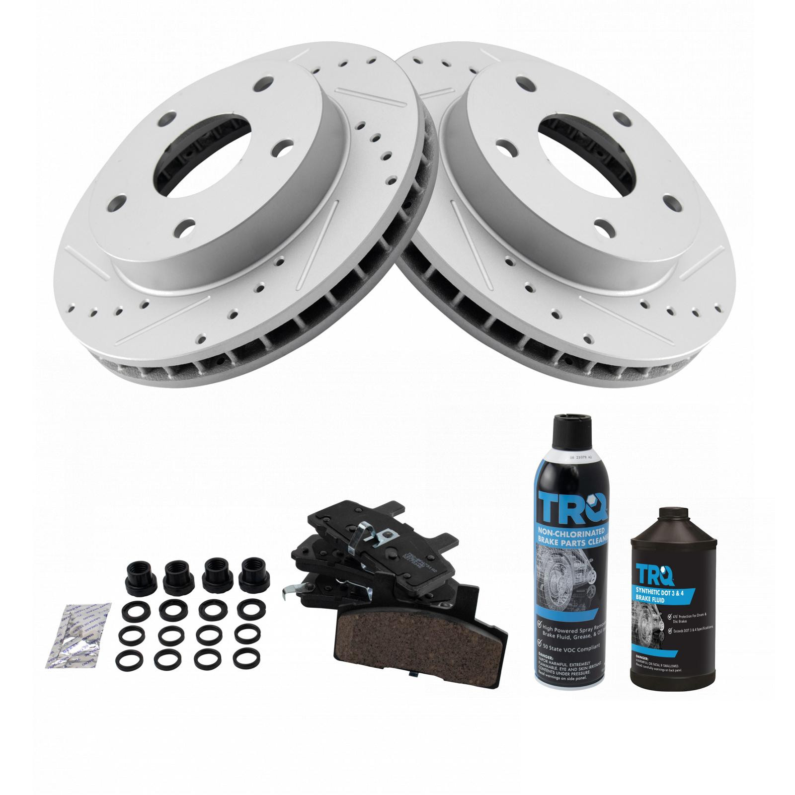 Kit Includes:(2) Front Performance Brake Rotors, Kit Includes:(1) 12 oz DOT 3 & 4 Brake Fluid, Kit Includes:(1) 13 oz Non-Chlorinated 50 State Formula Brake Cleaner, Kit Includes:(1) Front Ceramic Brake Pad Set with Contact Point Grease & Hardware