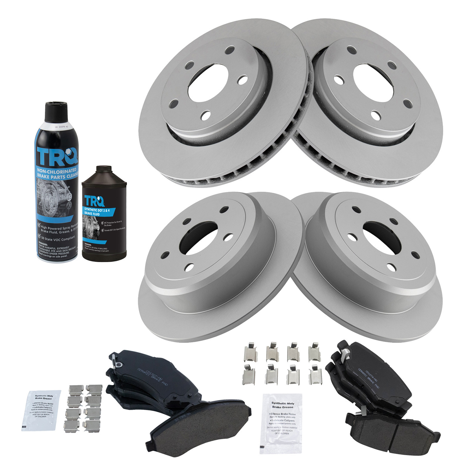 Kit Includes:(1) Rear Ceramic Brake Pad Set with Contact Point Grease & Hardware, Kit Includes:(1) Front Ceramic Brake Pad Set with Contact Point Grease & Hardware, Kit Includes:(1) 13 oz Non-Chlorinated 50 State Formula Brake Cleaner, Kit Includes:(2) Rear G-Coated Brake Rotors, Kit Includes:(2) Front G-Coated Brake Rotors, Kit Includes:(1) 12 oz DOT 3 & 4 Brake Fluid