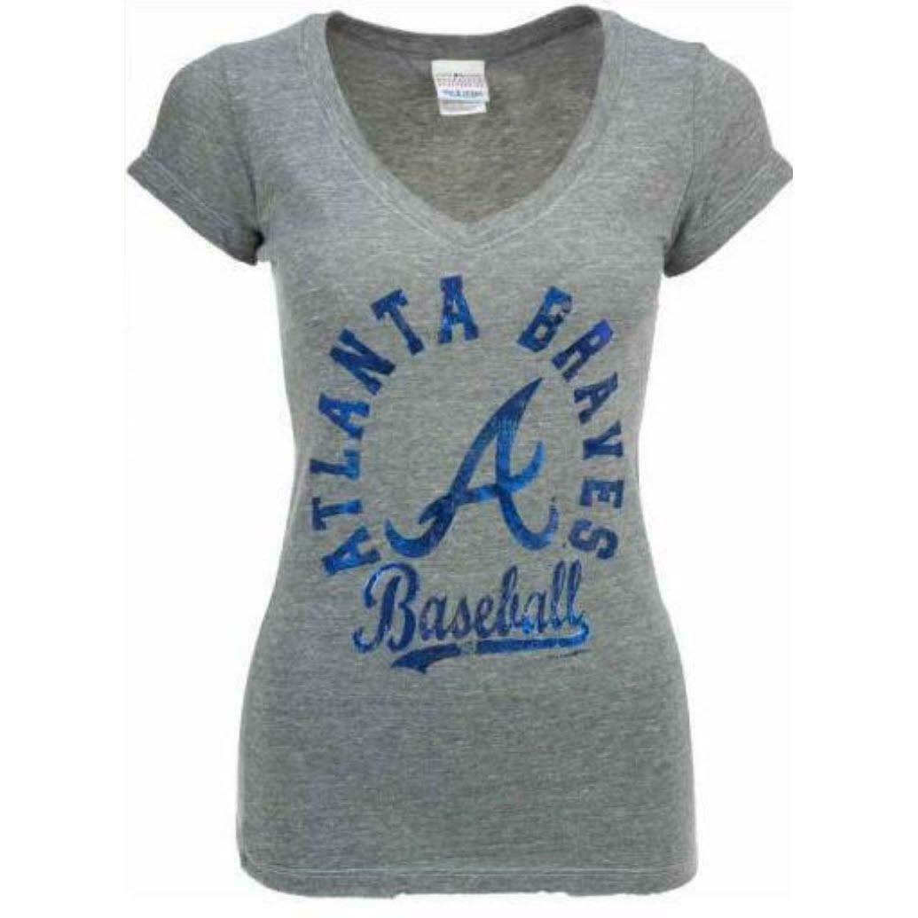 Show your support for your Braves with a little bling and dazzle in this Triblend 5th & Ocean (a New Era brand) gray foil V-neck cap sleeve shirt.