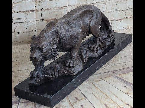 The largest and possibly most dangerous of the four "big cats," the tiger is an apex predator with virtually no natural predators, residing at the top of their food chain. These magnificent creatures can reach up to 3.3 meters (11 feet) in total length, weigh up to 660 pounds, and have canines up to 4 inches long. Owning this beautiful statue is far safer than encountering this stunning creature in real life. This large tiger roams the open land, searching for its next meal. In the distance, it spots an unsuspecting victim. He begins to crouch low, his eyes narrowing with intensity. His tail lowers and drags along the ground as his nose sniffs the air, identifying the prey's scent. He goes in for the kill.