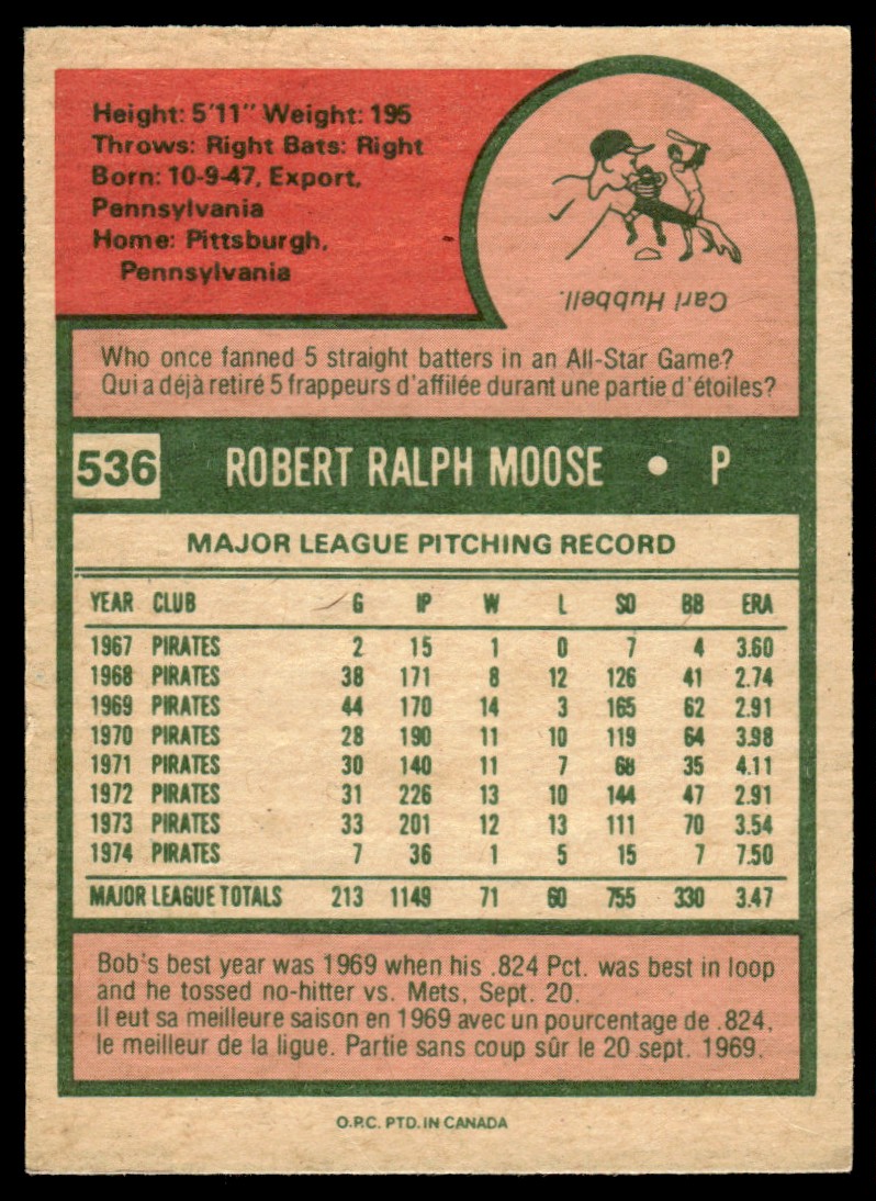 | 1975 O-Pee-Chee Bob Moose Pittsburgh Pirates #536 R96 | ||||||||||||||||||