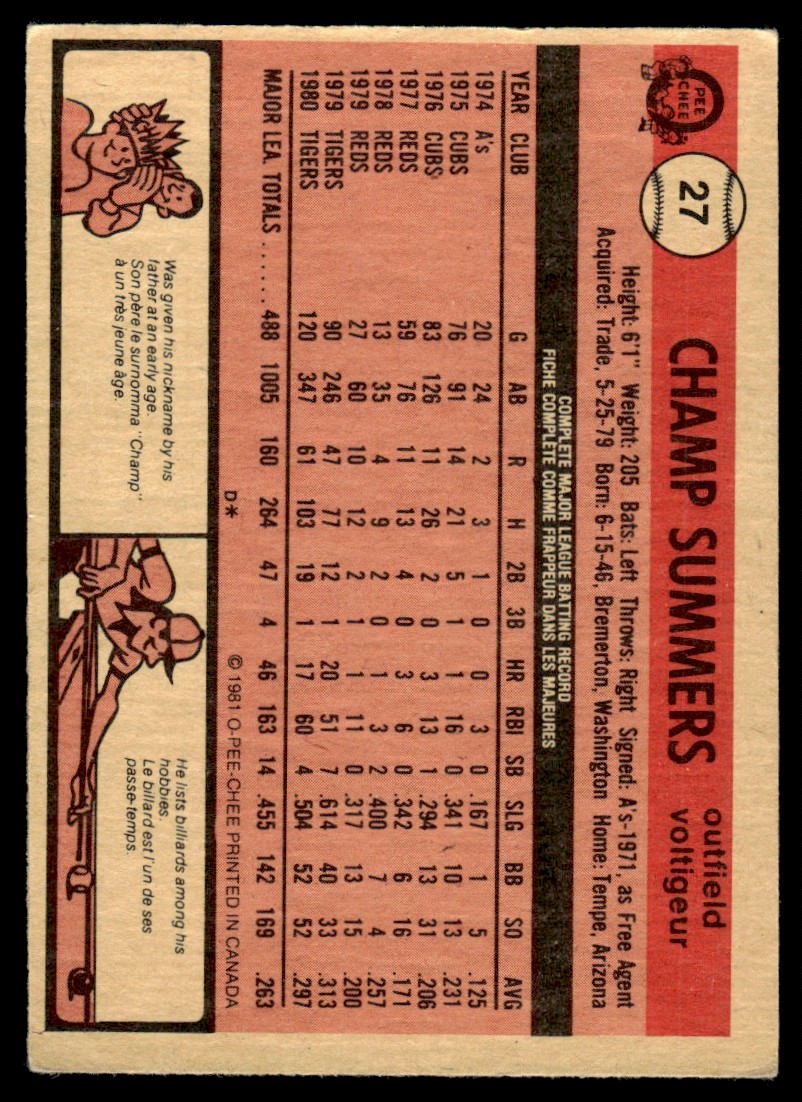 | 1981 O-Pee-Chee Champ Summers Detroit Tigers #27 R64 | ||||||||||||||||||