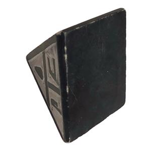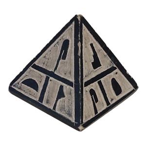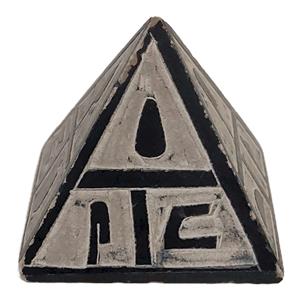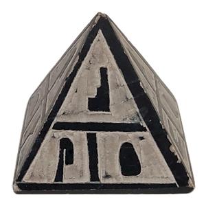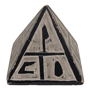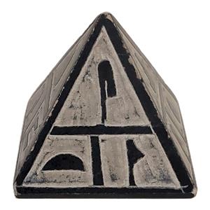 Vintage Egyptian gray basalt stone pyramid paperweight figurine with etched Hieroglyphics calligraphy symbols.