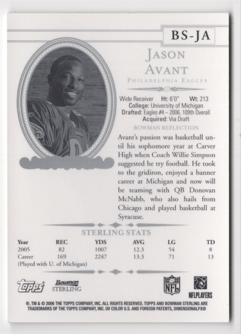 | 2006 BOWMAN STERLING JERSEY JASON AVANT #BS-JA | ||||||||||||||