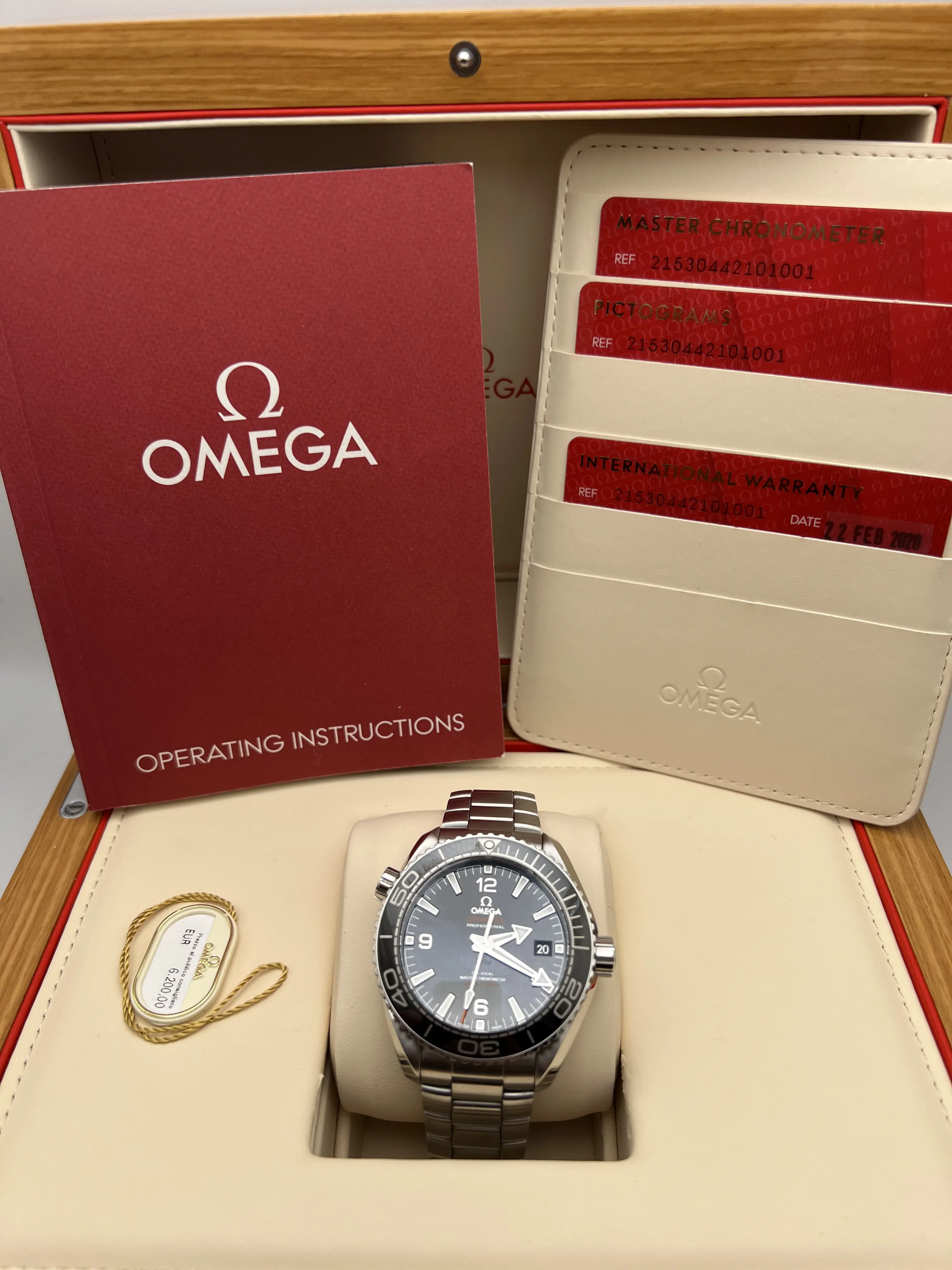 Omega Seamaster Planet Ocean 600M 44mm Black Dial 215.30.44.21.01.001, Stainless Steel Case and Bracelet, Black Dial , Date Window, Helium Escape Valve, anti-magnetic feature. Watch is in excellent condition with light handling marks. Watch comes Complete with Box, Papers, Manuals & Hangtag.