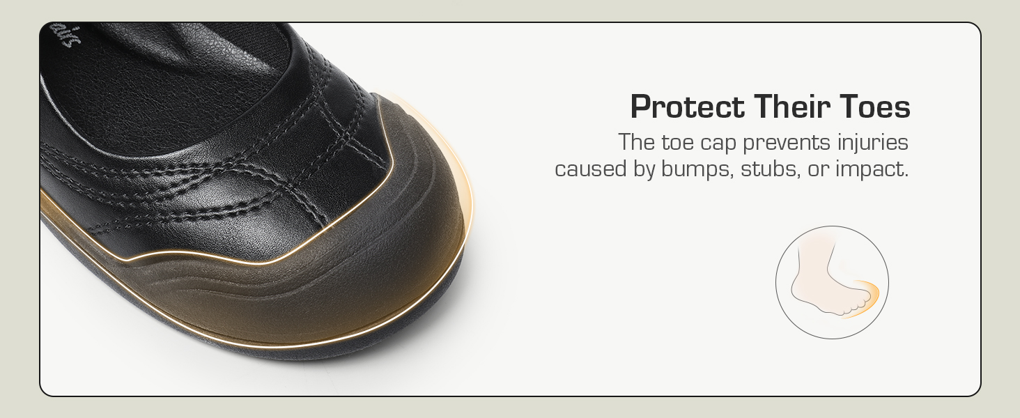 • Toe Protection: The shoes have an extended sole that wraps around the toe area, providing cap-like protection for safety with every step.