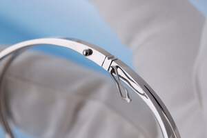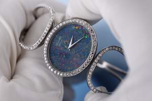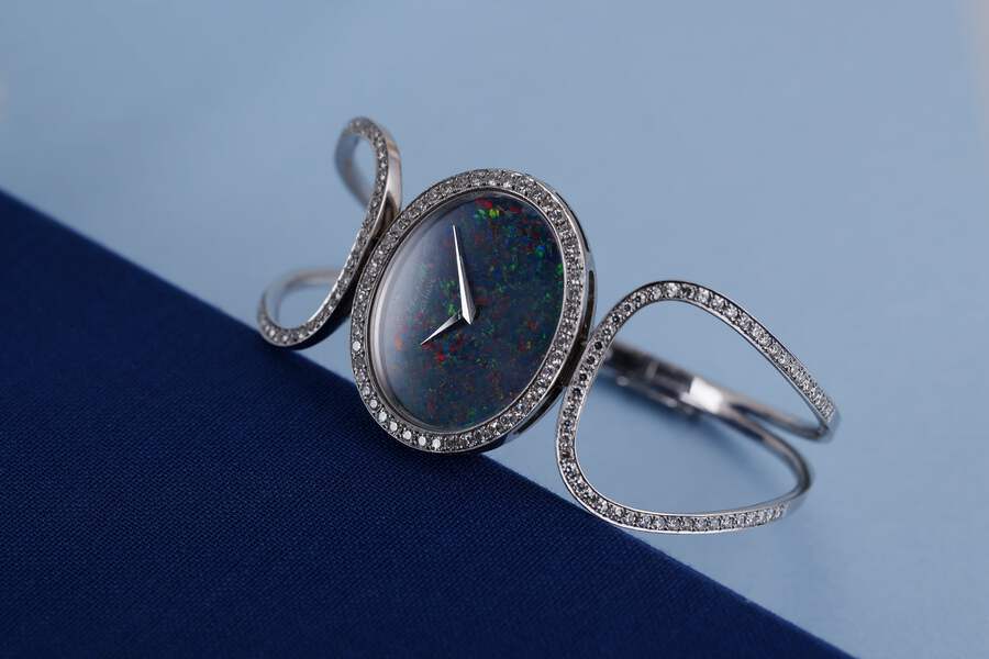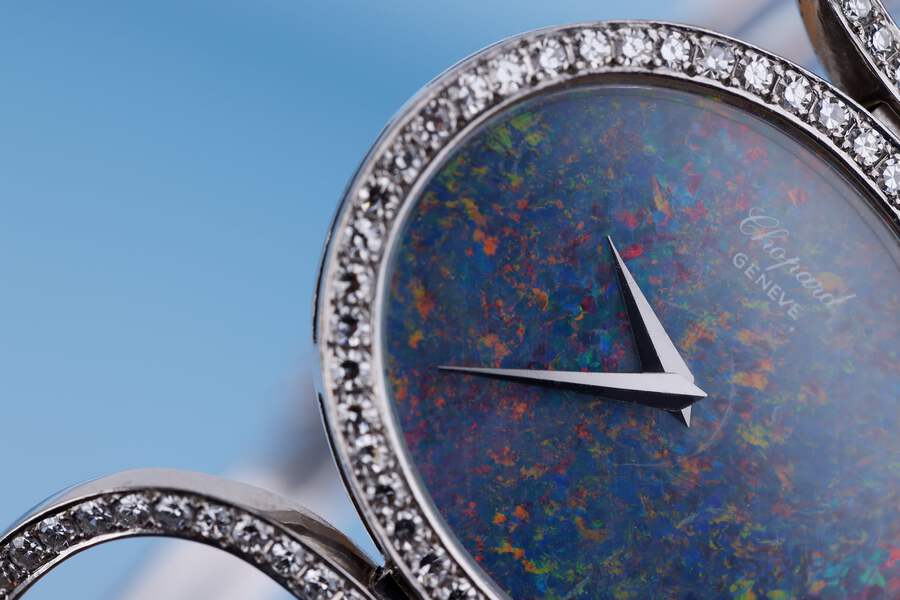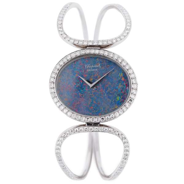 Pre-owned, excellent condition ladies Chopard L.U.C Bracelet Bangle Watch in 18k White Gold. Opal dial, an 18k White Gold Oval 30mm case, diamond bezel, concealed crown, looped diamond bangle bracelet and bracelet clasp, sapphire crystal glass and manual winding movement. L.U.C marking on bracelet.