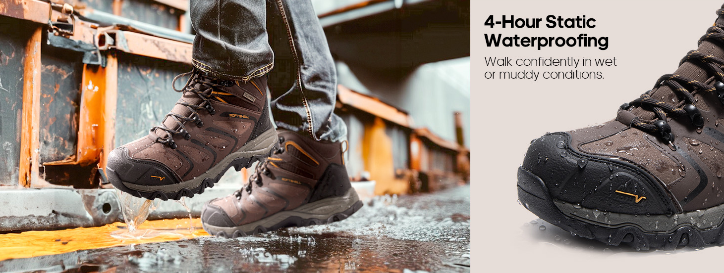 • Waterproof Upper: With a static waterproof upper that lasts for up to 4 hours, these men’s steel toe boots keep feet dry and comfortable even in wet and challenging work environments.