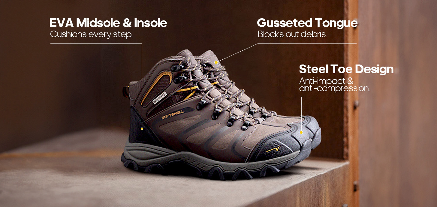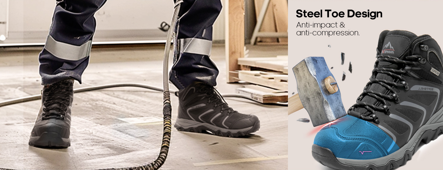 • Enhanced Toe Protection: These work boots for men feature a steel toe and rubber toe cap that protect your feet from falling objects and accidental compression.