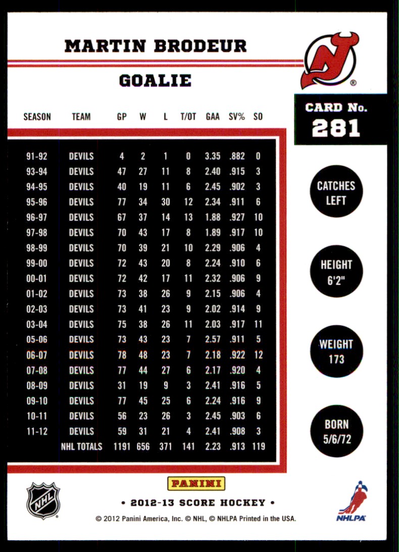 | 2012-13 Score Martin Brodeur New Jersey Devils #281 |