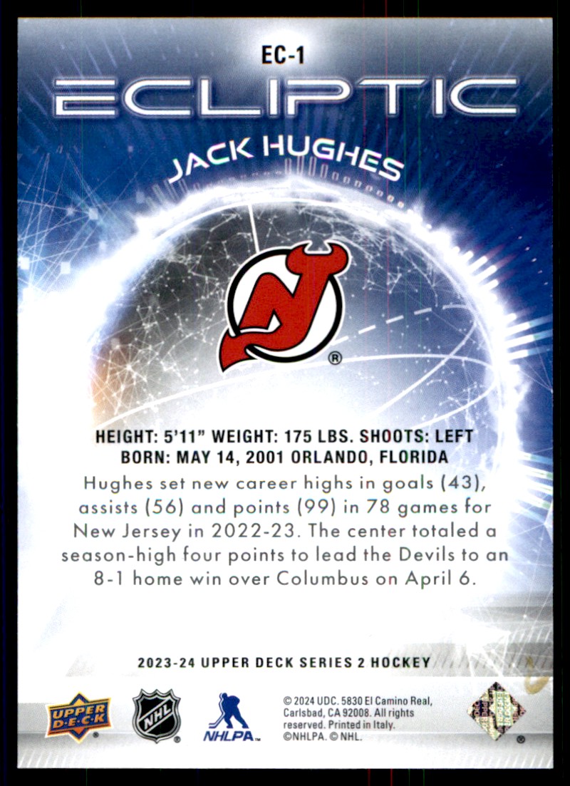 | 2023-24 Upper Deck Ecliptic Jack Hughes New Jersey Devils #EC-1 |