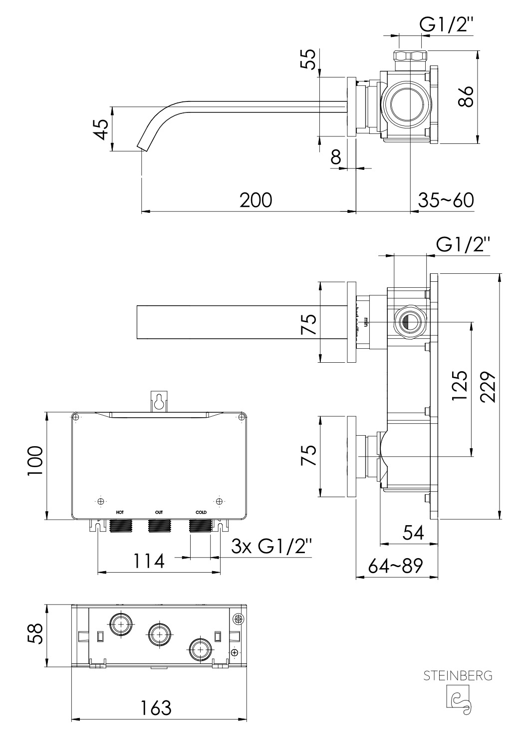 Mitigeur lavabo mural Steinberg série 135, régulation entièrement électronique de la quantité et de la température, portée 200 mm, 1351814E, couleur : chrome