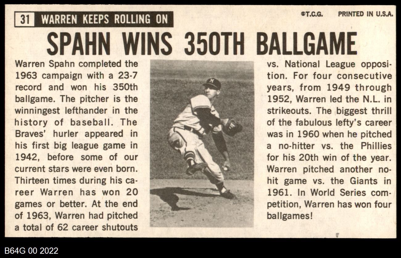 | 1964 Topps Giants #31 Warren Spahn | 7 - NM | Front | Back |