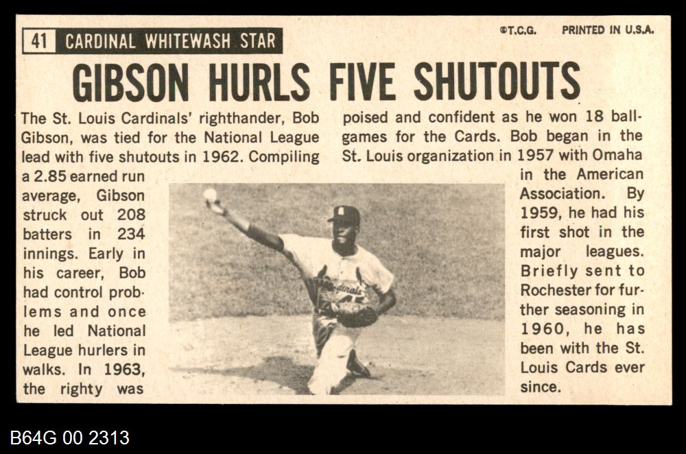 | 1964 Topps Giants #41 Bob Gibson | 6 - EX/MT | Front | Back |