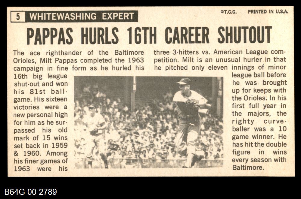 | 1964 Topps Giants #5 Milt Pappas | 7 - NM | Front | Back |