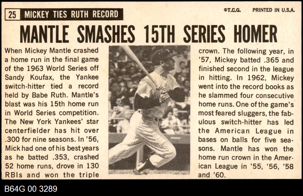 | 1964 Topps Giants #25 Mickey Mantle | 6 - EX/MT | Front | Back |