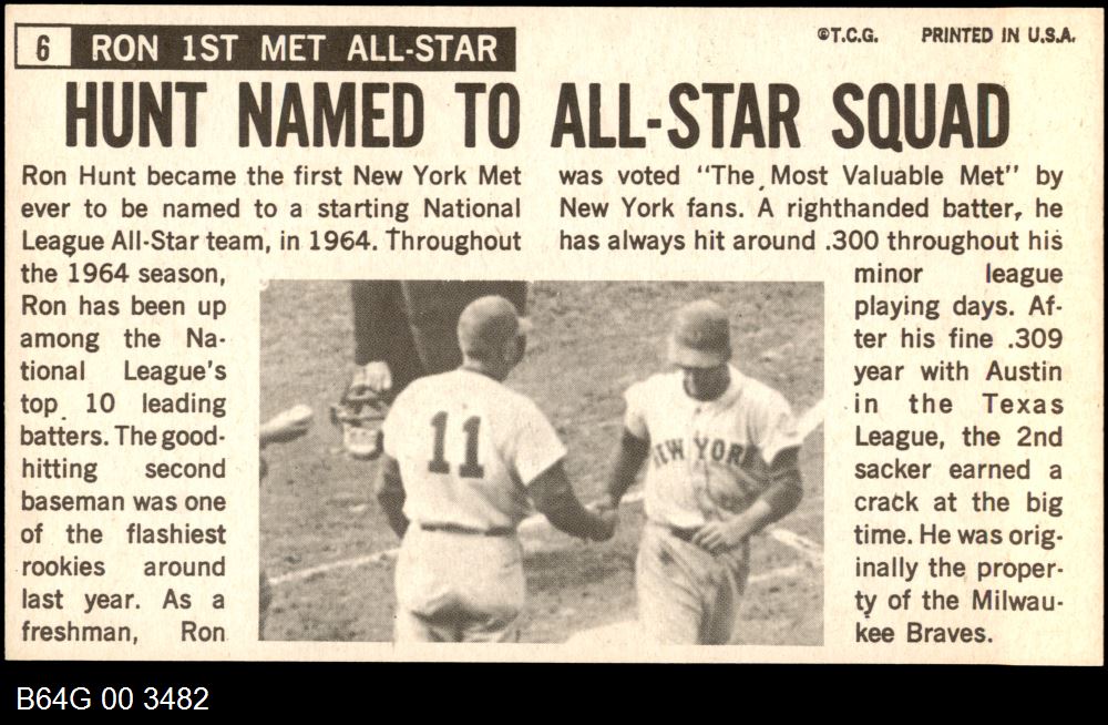 | 1964 Topps Giants #6 Ron Hunt | 6 - EX/MT | Front | Back |
