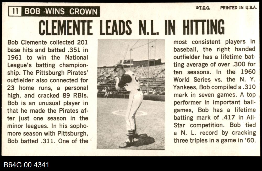 | 1964 Topps Giants #11 Roberto Clemente | 6 - EX/MT | Front | Back |