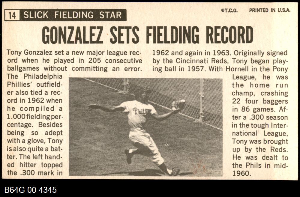 | 1964 Topps Giants #14 Tony Gonzalez | 6 - EX/MT | Front | Back |