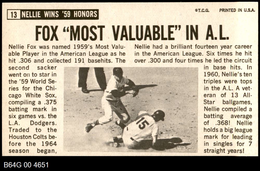 | 1964 Topps Giants #13 Nellie Fox | 7 - NM | Front | Back |
