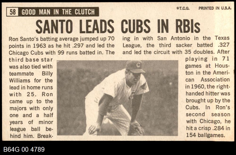 | 1964 Topps Giants #58 Ron Santo | 6 - EX/MT | Front | Back |