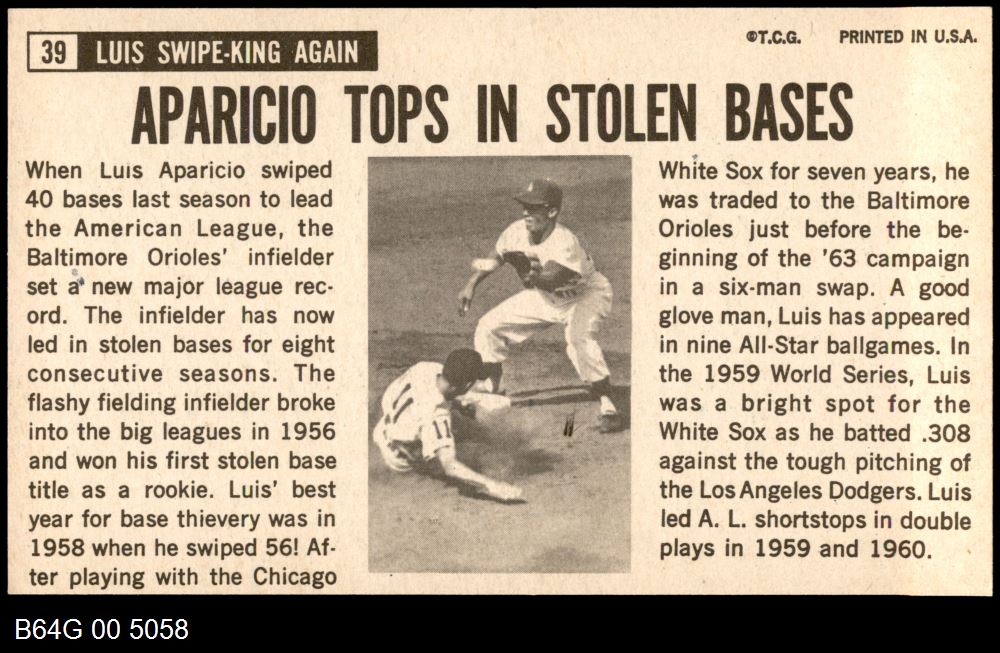 | 1964 Topps Giants #39 Luis Aparicio | 6 - EX/MT | Front | Back |