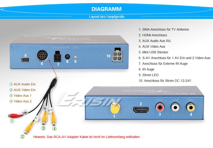 - Standard AV-Anschluss für AV-Eingang und AV-Ausgang, hier sollen Sie eine Adapter-Kabel extern kaufen