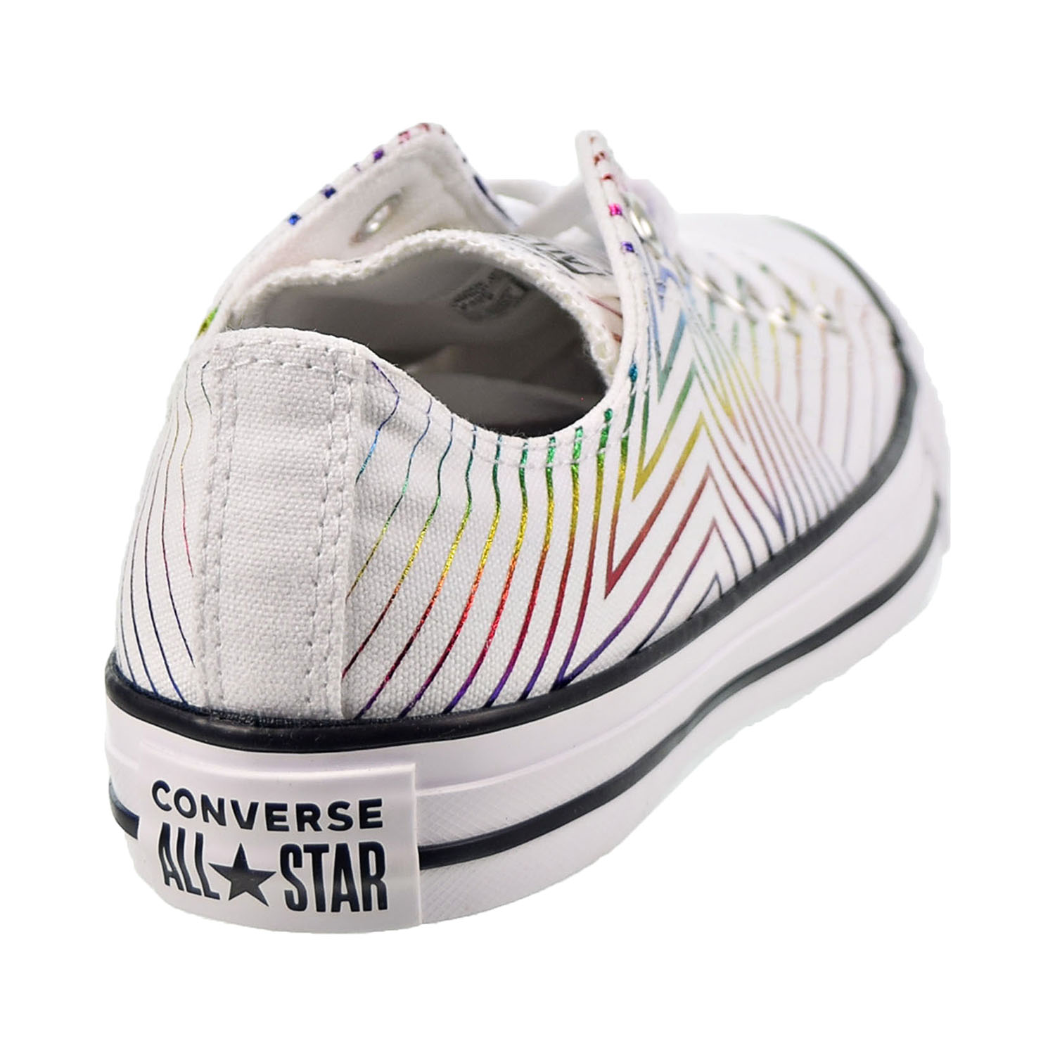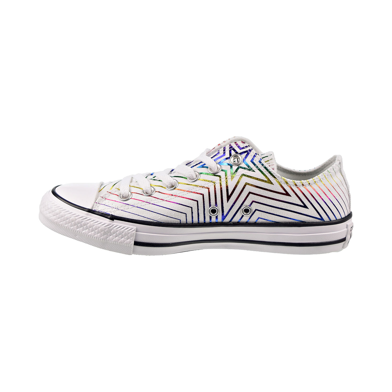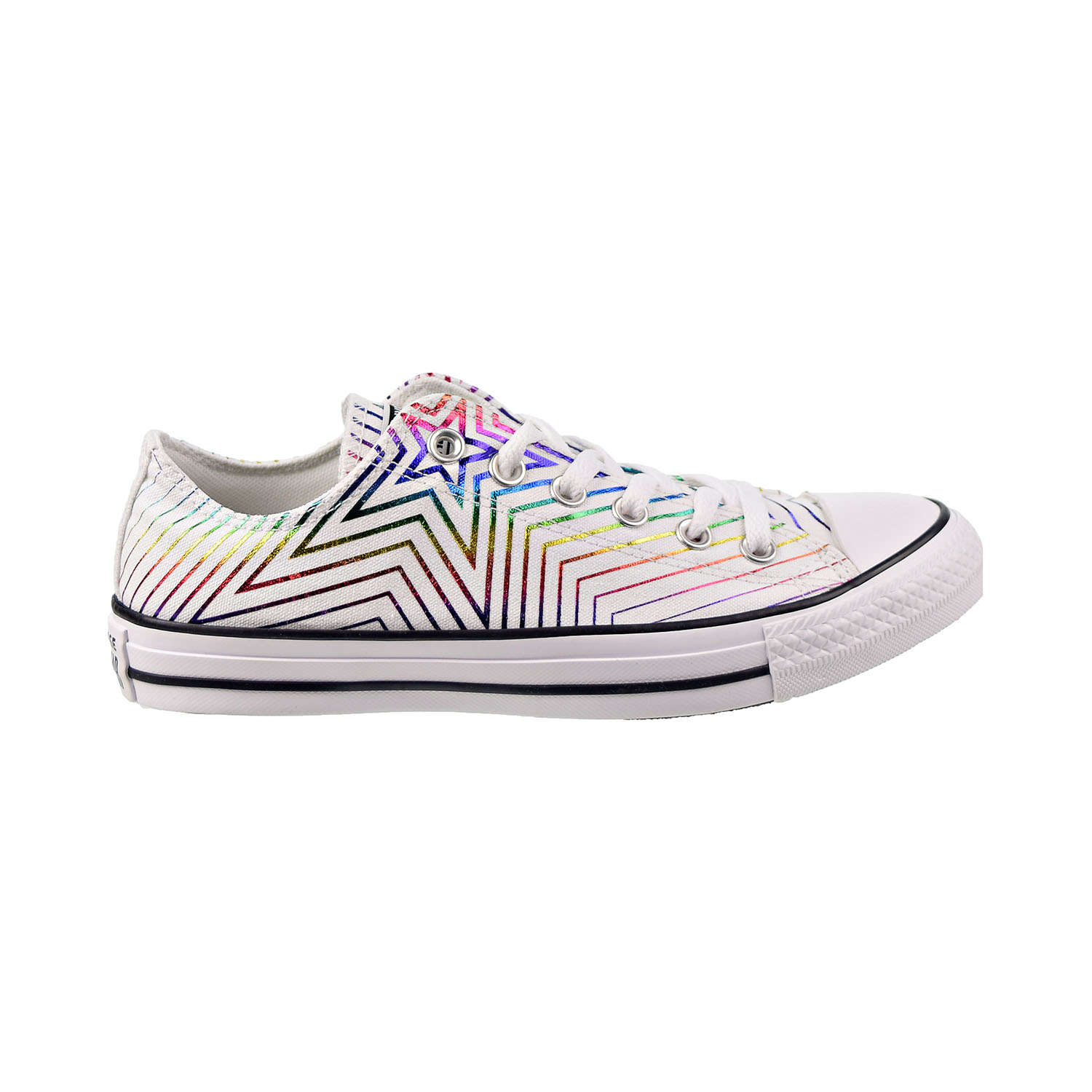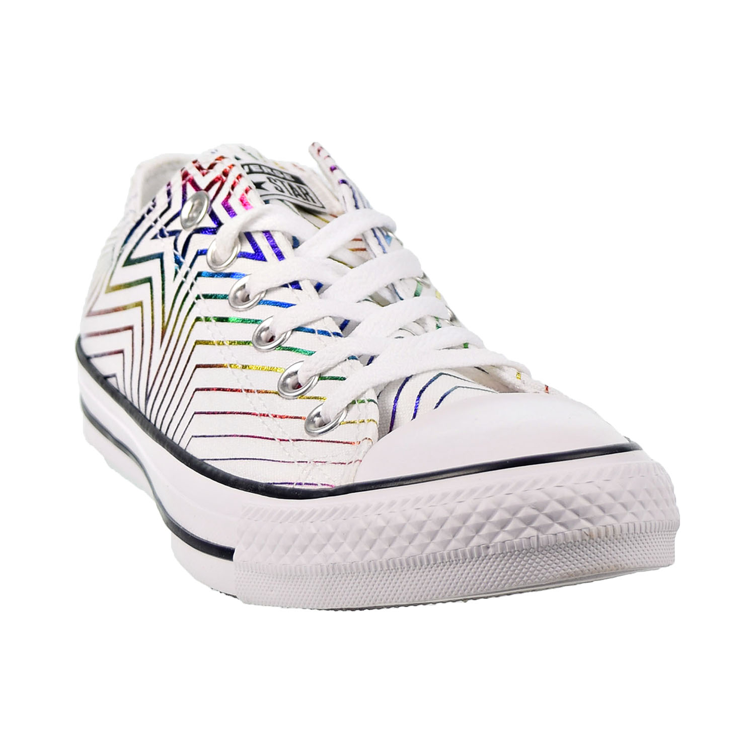 The Converse Chuck Taylor All Star Allthestar low-top sneakers feature an allover metallic exploding star print with an iridescent finish. With the same classic silhouette, these shoes look great with their futuristic feel and provide comfort. The patch logo, which reaches to the collar, gives these shoes a touch of style. The bold look of these sneakers stand out, giving your casual attire some needed vibrant color bursts.